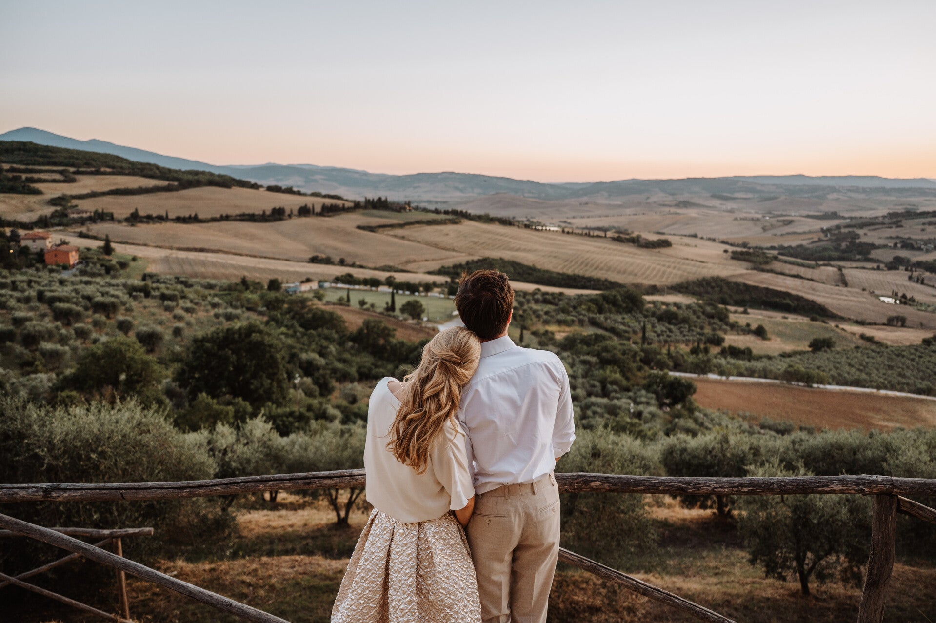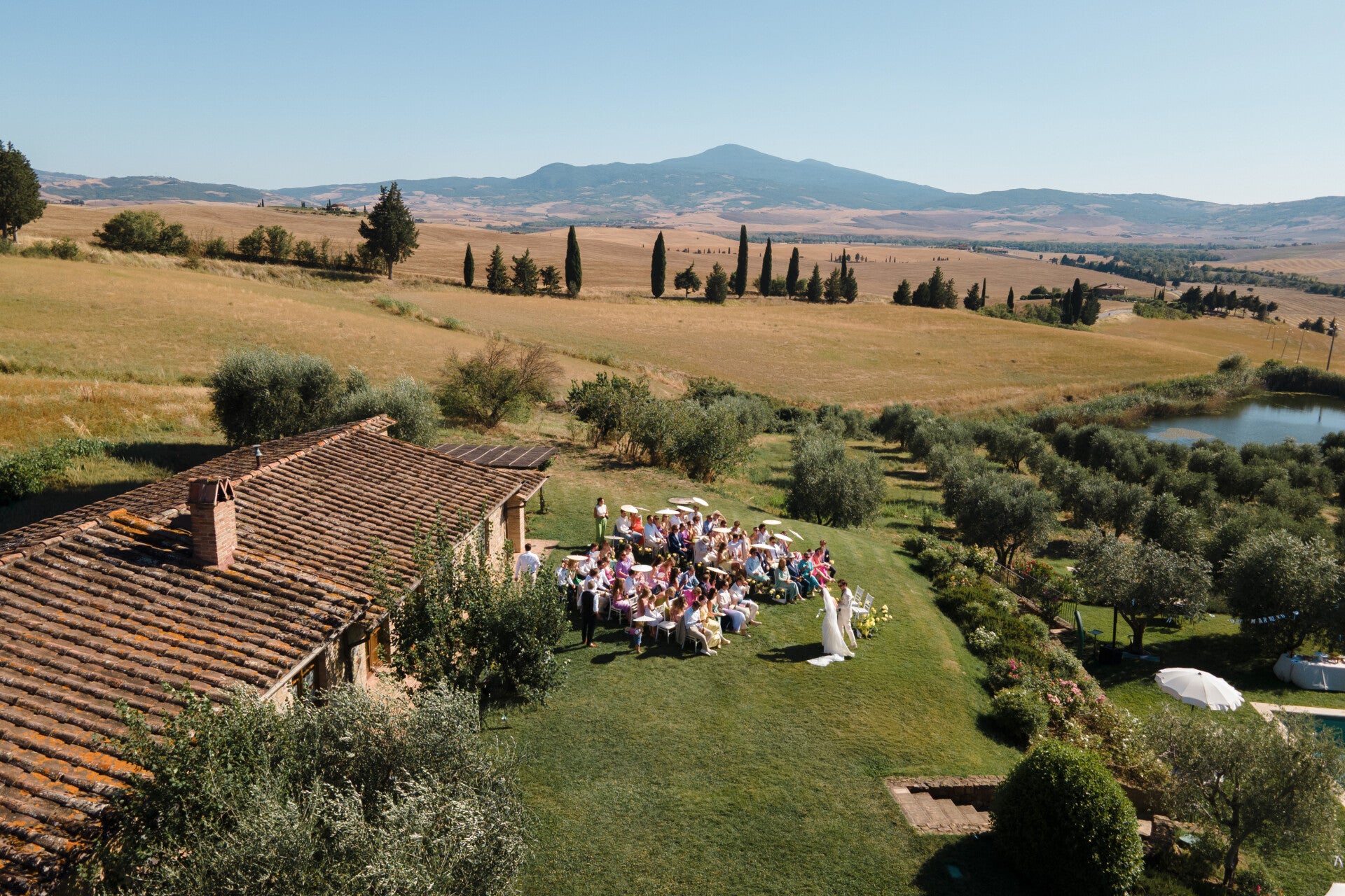 Imagine saying “I do” in the Tuscan hills: olive trees everywhere, long wooden tables glowing under string lights, plates of fresh pasta, Brunello flowing, and all your favourite people laughing into the warm evening air.